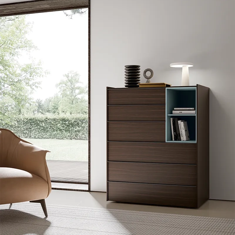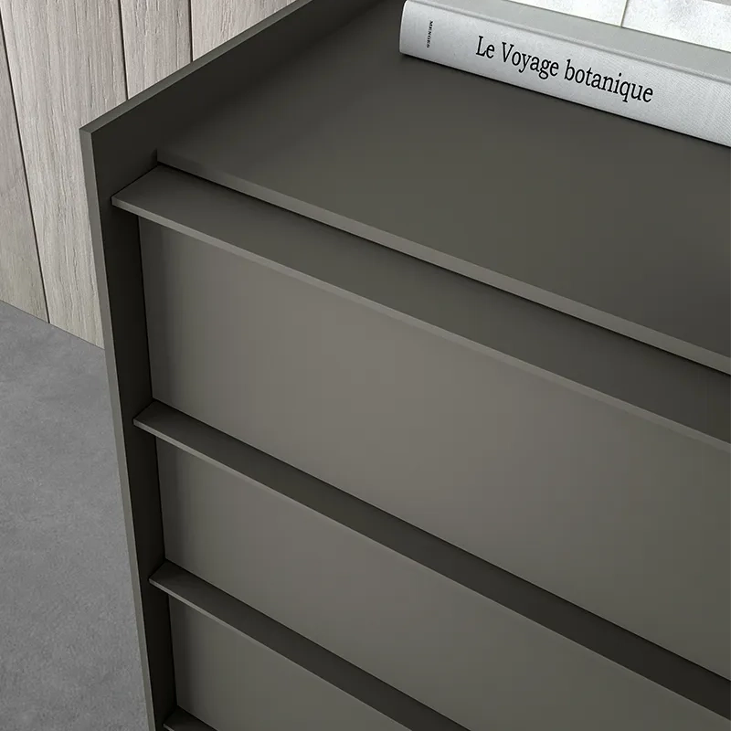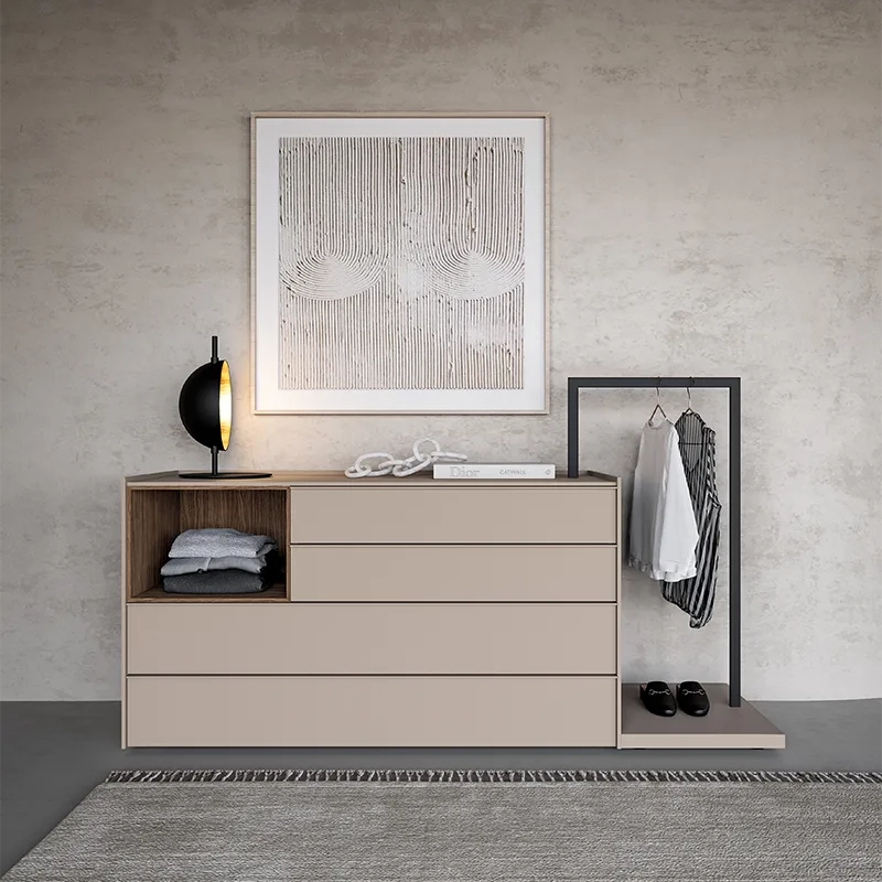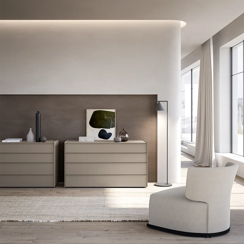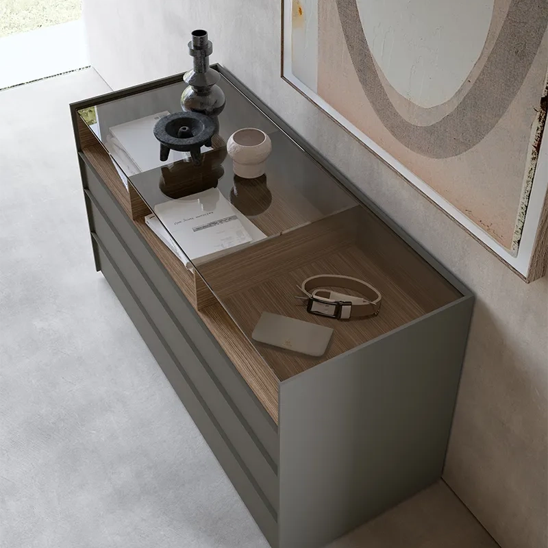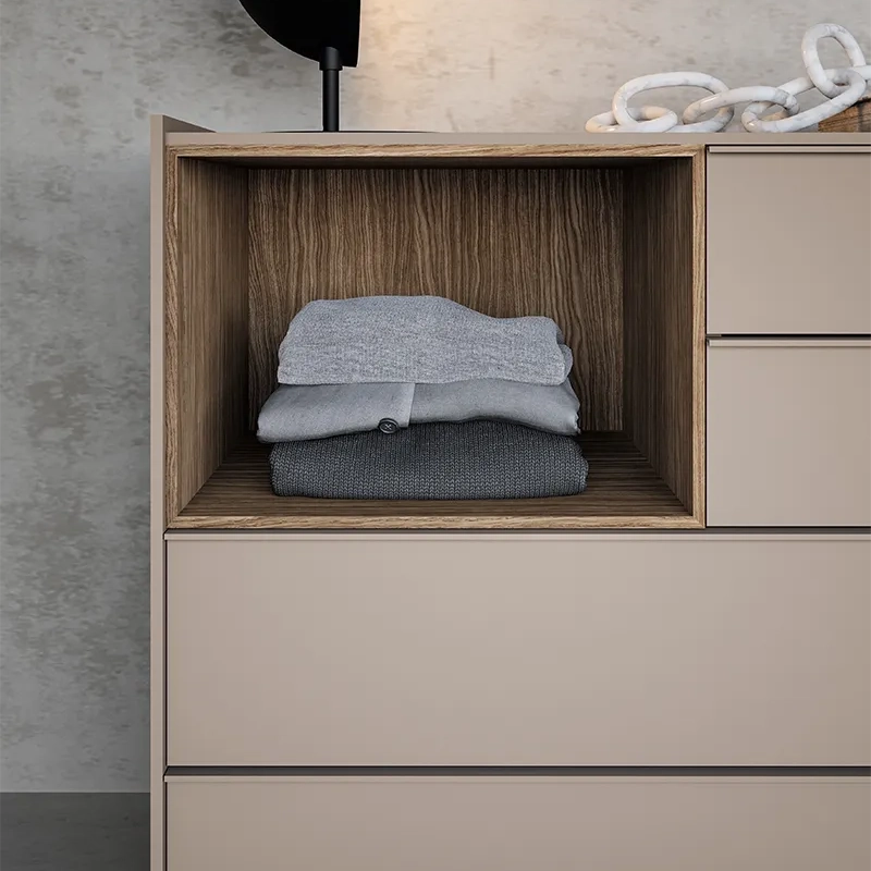 Il comò semplice Stream si caratterizza per le sue linee pulite e il top con bordo leggermente rialzato, progettato per creare un effetto “a vassoio” che aggiunge praticità senza rinunciare all’eleganza. Per chi desidera un tocco di dinamicità in più, la collezione Stream offre anche varianti con vani a giorno, perfetti per giocare con pieni e vuoti e valorizzare l’intera zona notte.