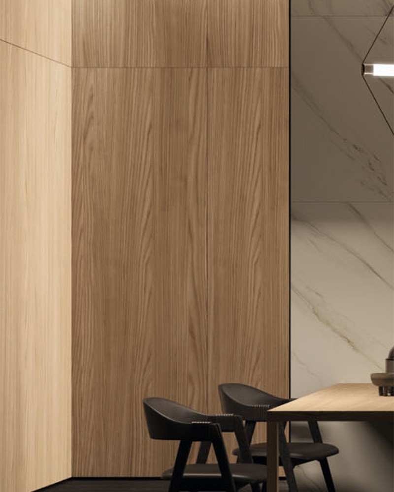 Il tavolo Woodset è disponibile in essenza rovere Nordic, materiale che conferisce calore naturale. Inoltre, il legno è trattato con finiture all’acqua eco-compatibili. Pertanto, resiste perfettamente all’uso quotidiano mantenendo la sua bellezza originale.