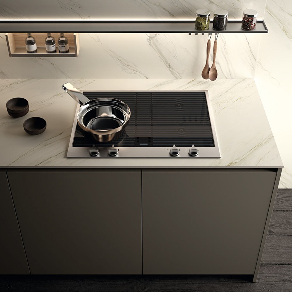 Sì, puoi personalizzare completamente la configurazione. Infatti, possiamo installare una cappa a isola di design al posto di quella integrata. Inoltre, marchi come Falmec o Elica offrono modelli spettacolari. Pertanto, la cucina diventa ancora più scenografica.