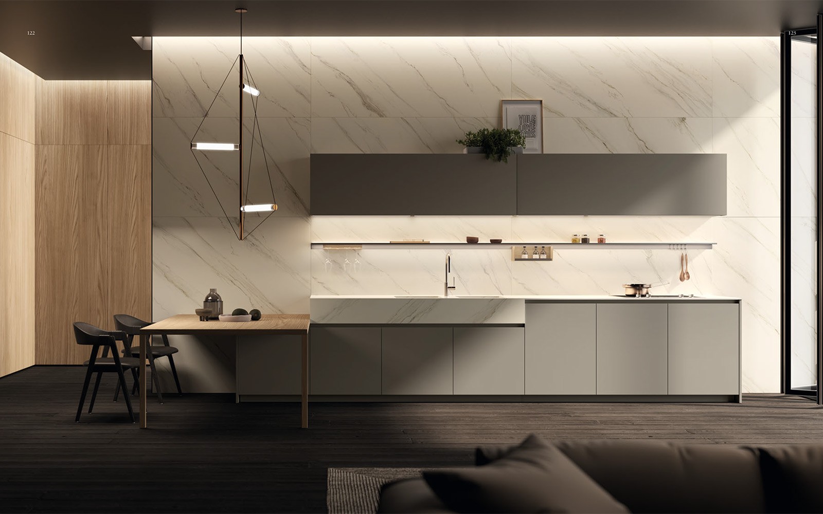 La cucina con tavolo penisola modello One 80 di Ernestomeda ridefinisce il concetto di spazio conviviale. Infatti, questa soluzione integra un tavolo scorrevole direttamente nella composizione. Per questo motivo, è perfetta per chi cerca flessibilità senza rinunciare all’estetica.