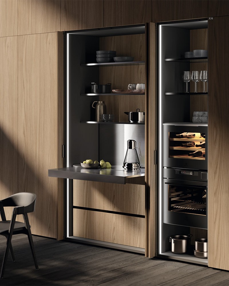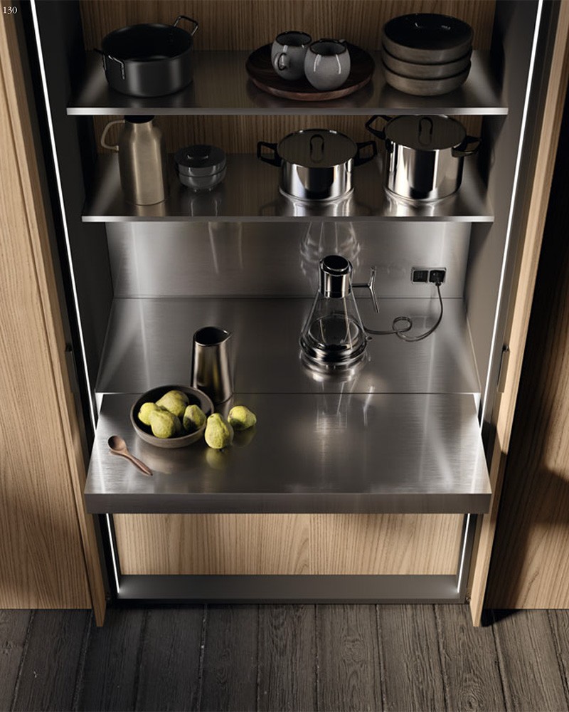 L’Armadio Indoor della cucina One 80 è un elemento a tutta altezza (249 cm) progettato per contenere tutto. Infatti, al suo interno trovano spazio elettrodomestici, dispensa e accessori.
