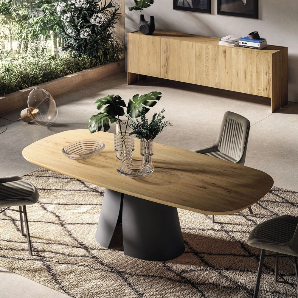 Nella versione con piano in legno, il tavolo presenta uno spessore di 5 cm e un bordo a saponetta.