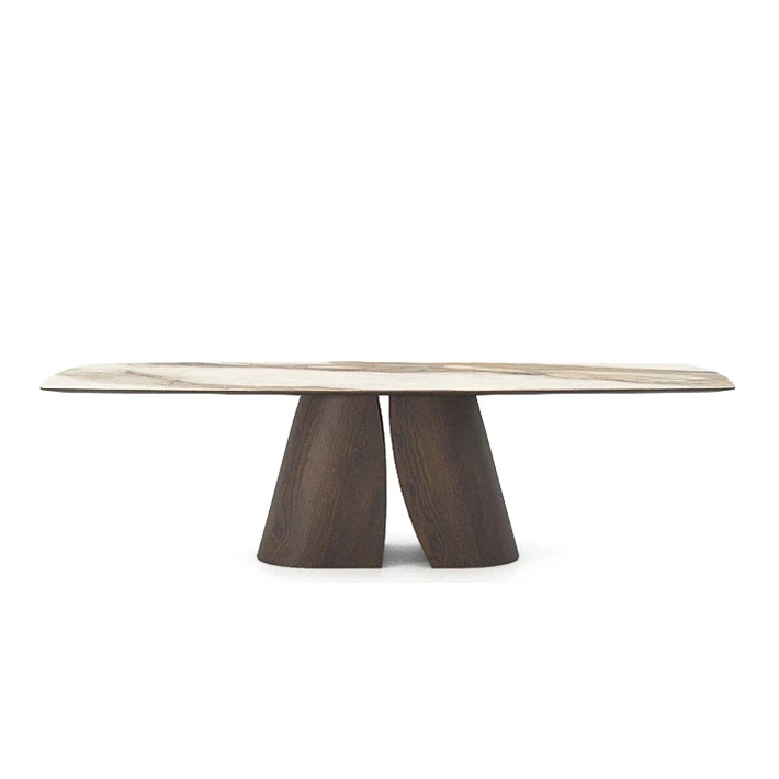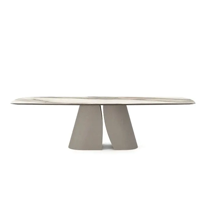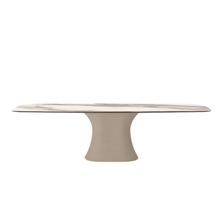 Il piano ovale, spesso 3,7 cm, presenta un bordo che si assottiglia verso il basso.