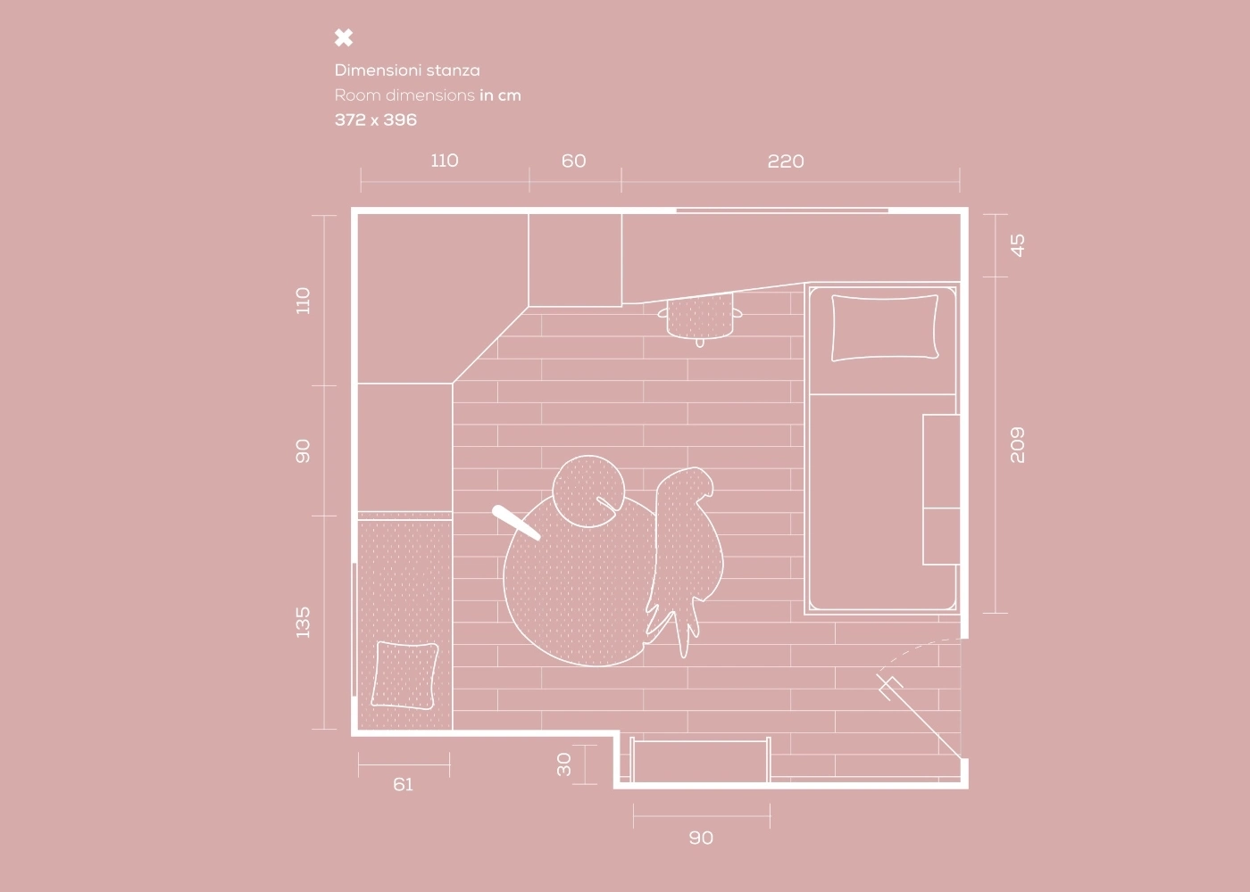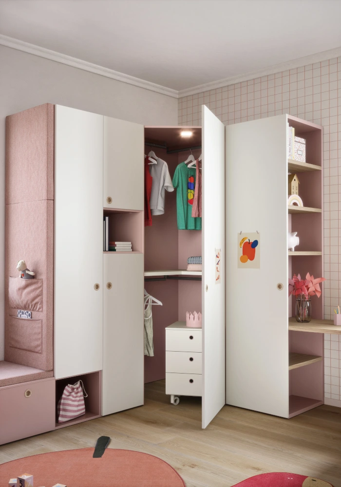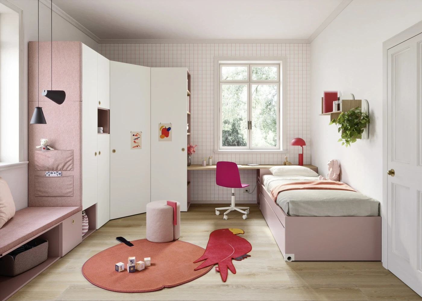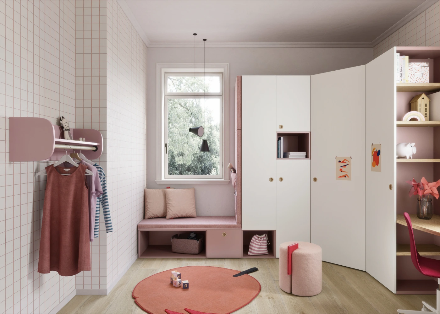 La composizione si sviluppa in una palette delicata e moderna che alterna rosa, bianco e nocciolo, creando un ambiente luminoso e accogliente. Ogni dettaglio è pensato per offrire un equilibrio tra funzionalità ed estetica, tipico delle camerette firmate Nidi.