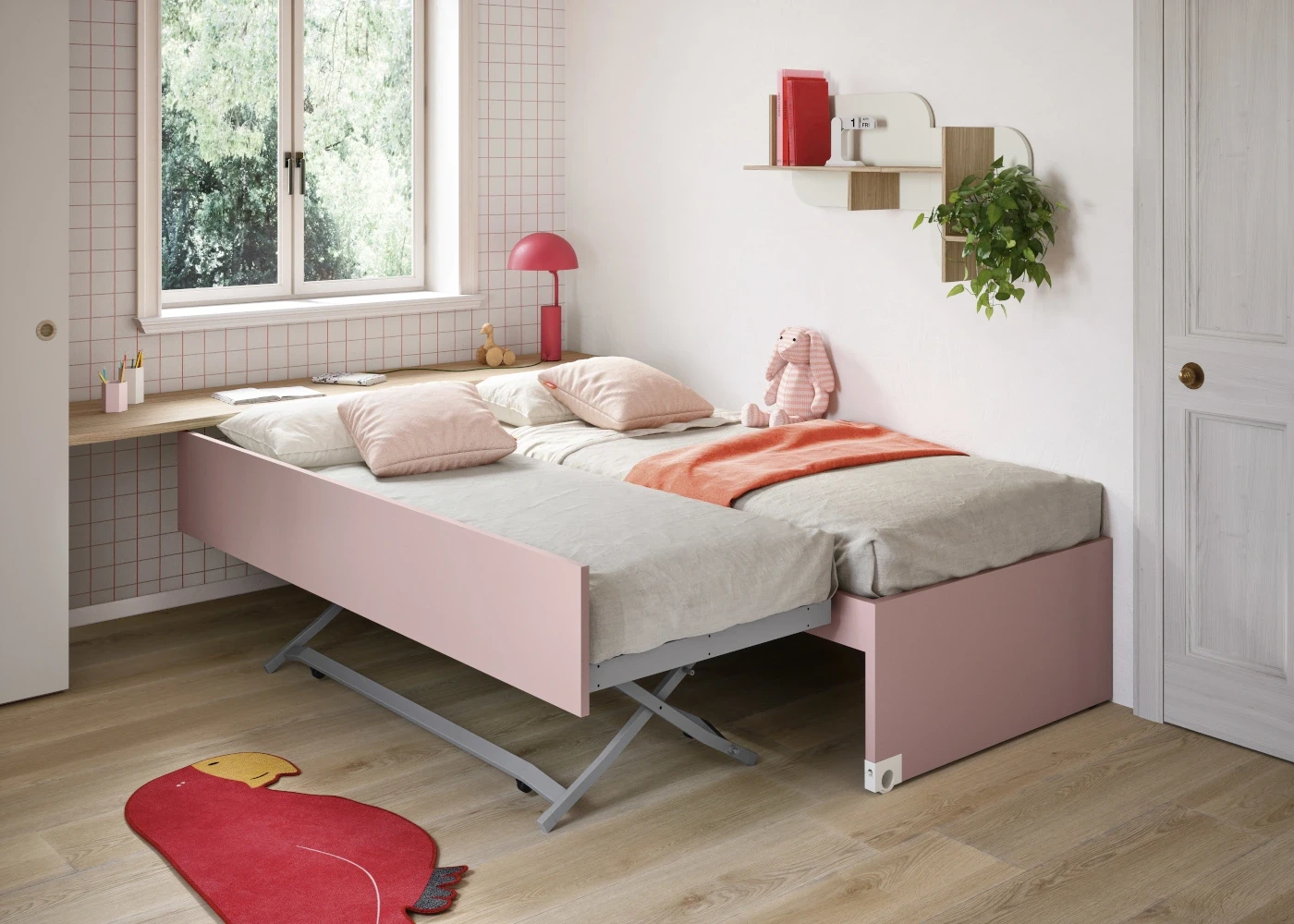 Il cuore della composizione è il letto alla turca con ruote e secondo letto estraibile. Questa soluzione si distingue per la versatilità: il secondo letto può trasformarsi in piano d’appoggio, ospitare una rete aggiuntiva oppure fungere da base per il piano scrittoio.