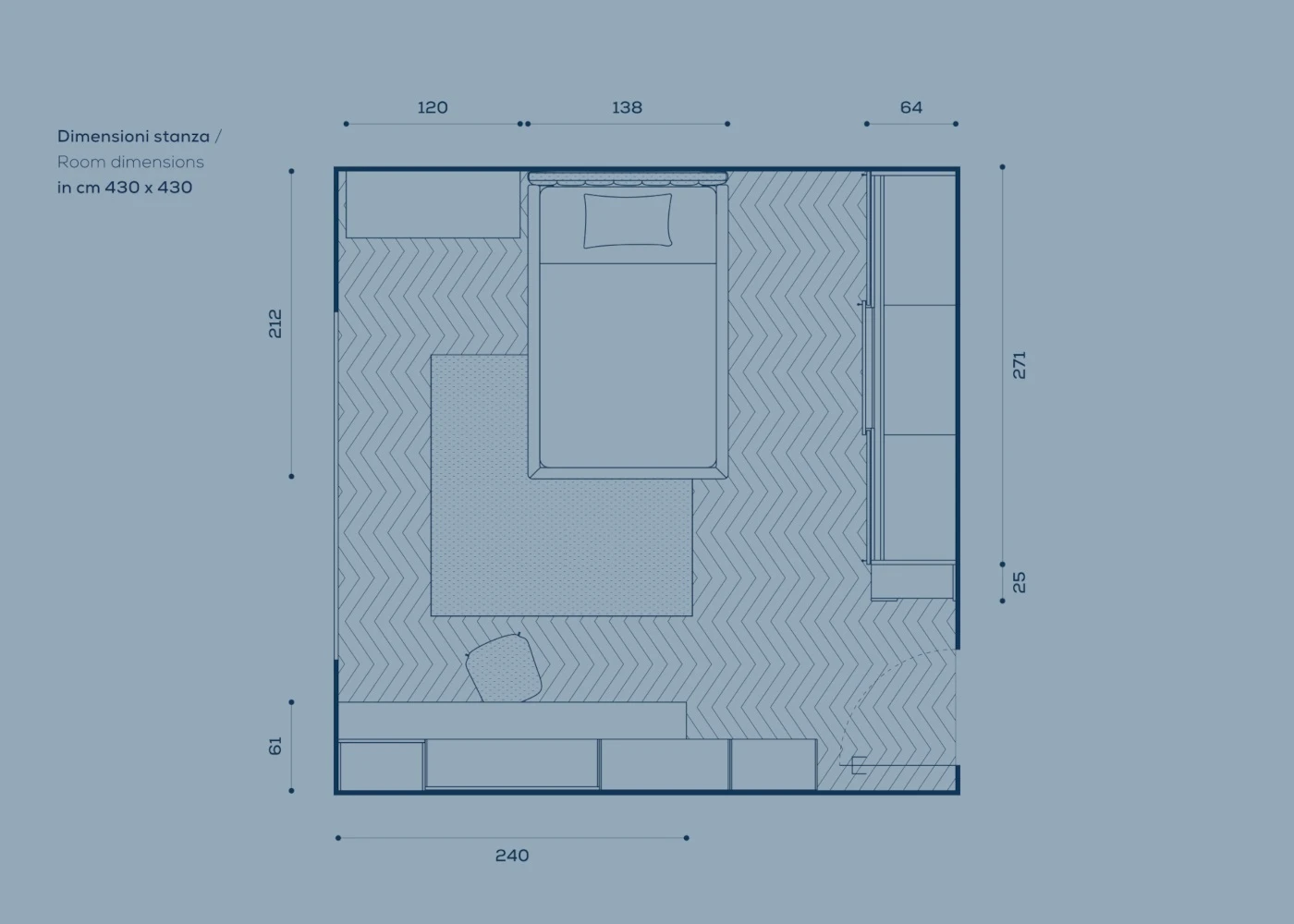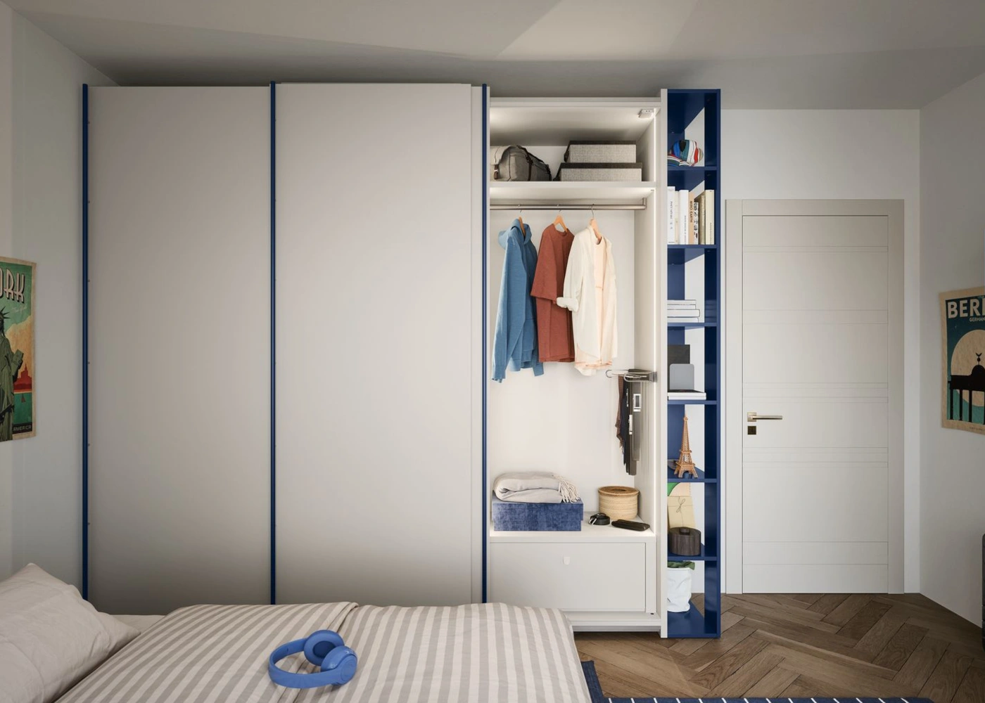 La composizione include un armadio scorrevole modello Nit a tre ante nel colore Nuvola 50, con maniglie a tutta altezza modello Ben in finitura Mare 21.