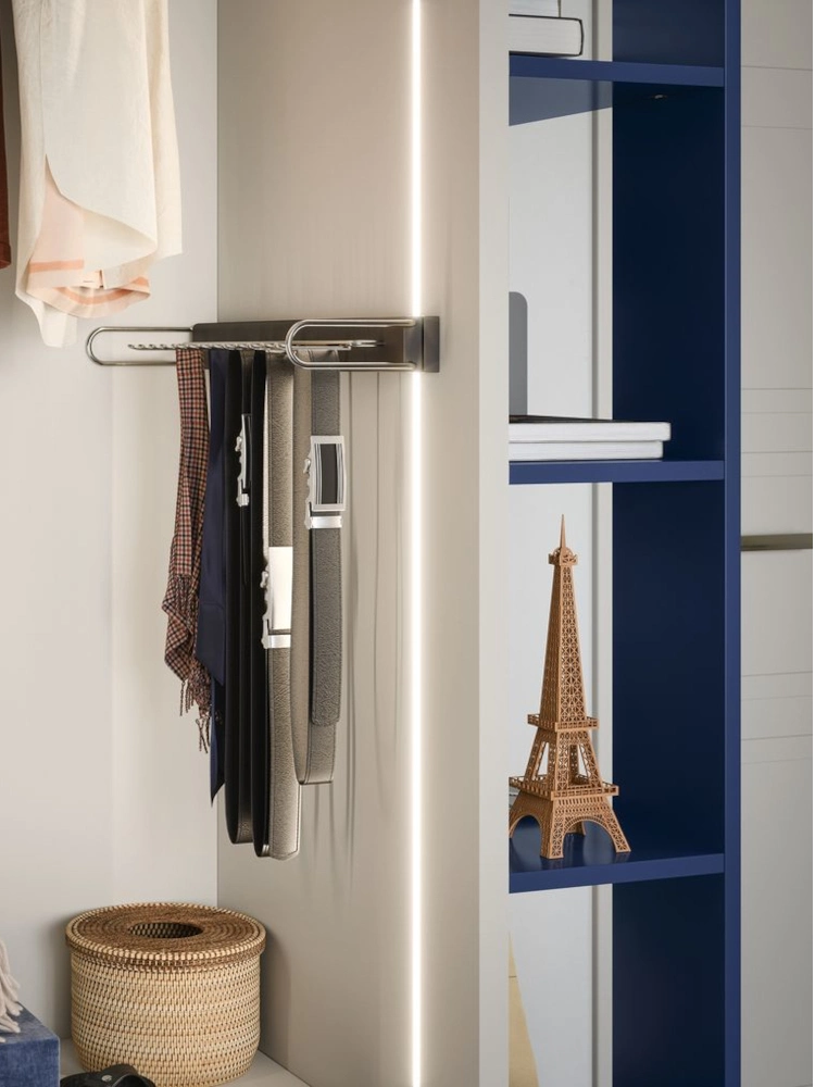 Il terminale con ripiani Band (colore Mare 21), la luce LED interna e il porta cravatte estraibile completano un armadio elegante e altamente organizzato.