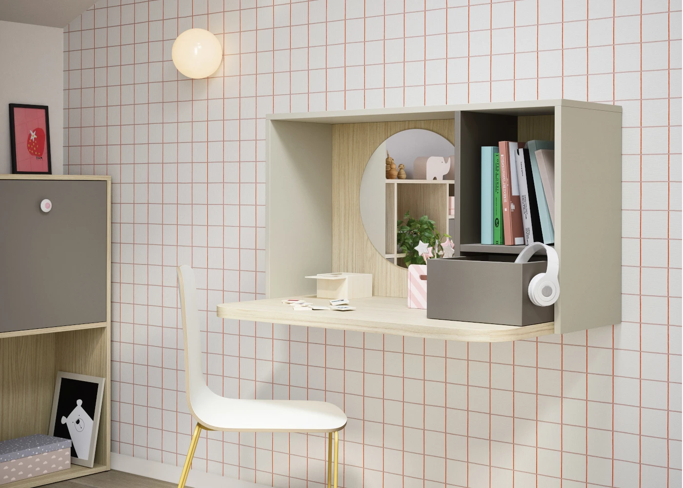 La zona studio è un elemento imprescindibile nella cameretta. In questa composizione, lo spazio è valorizzato grazie allo scrittoio Yucca, un modello sospeso che si distingue per la sua leggerezza visiva e praticità.