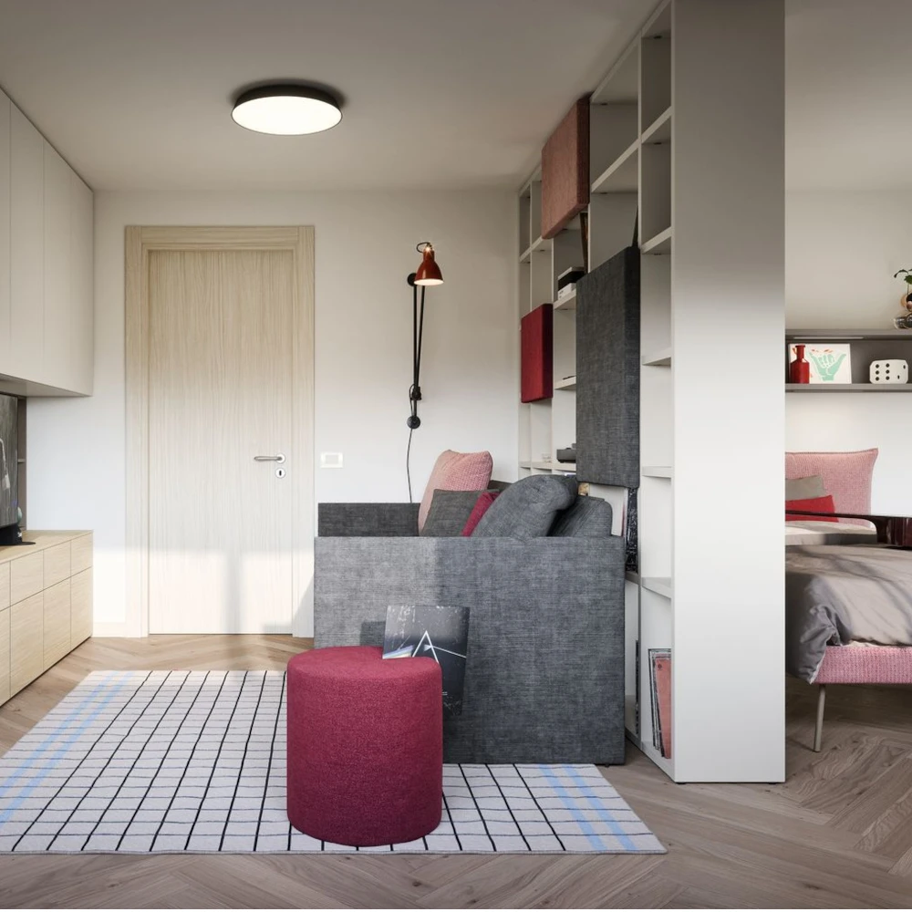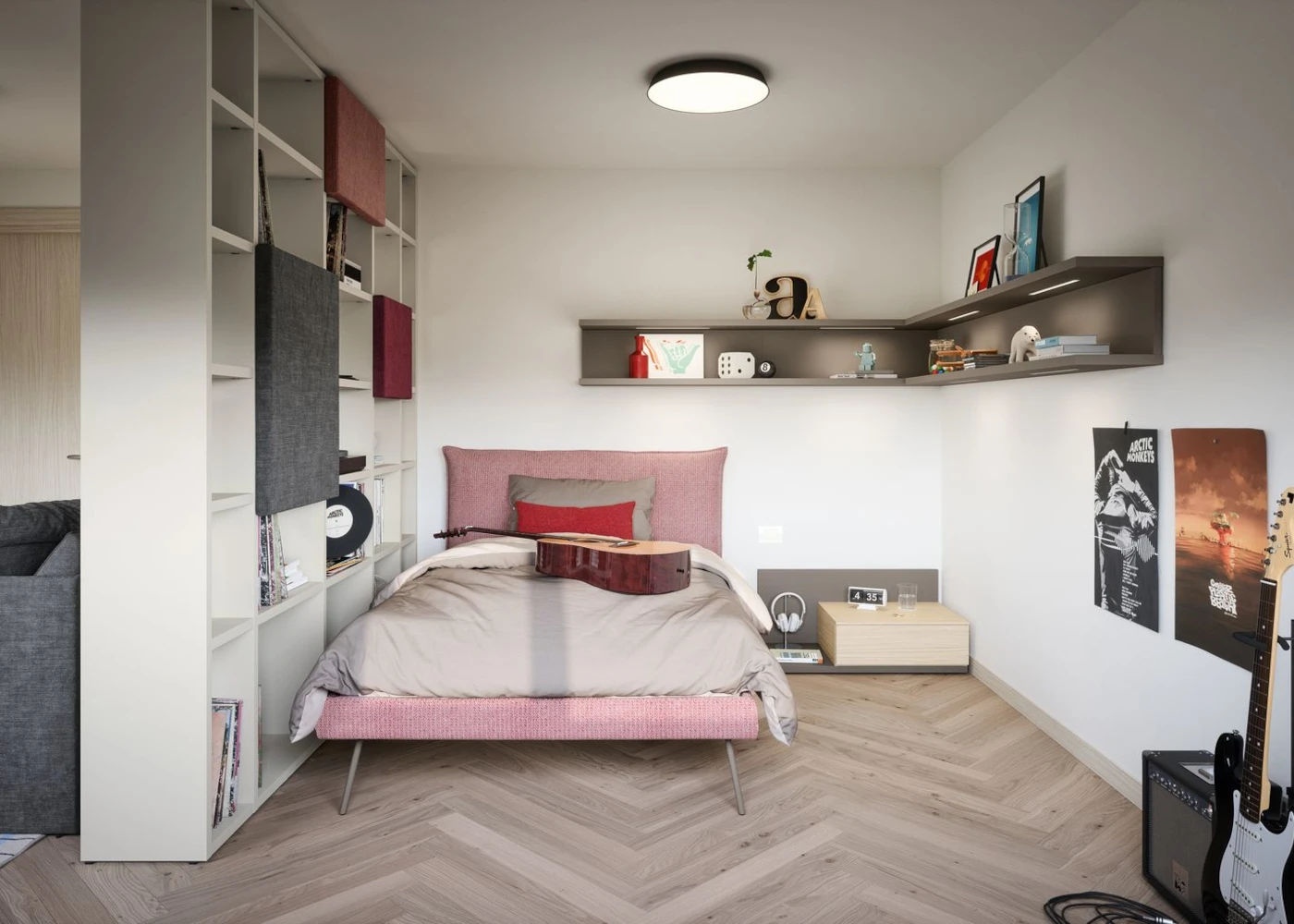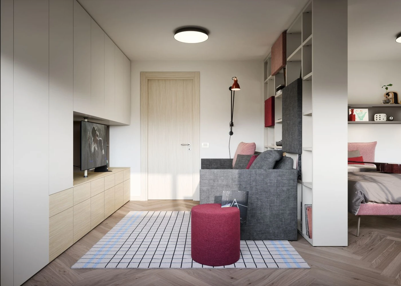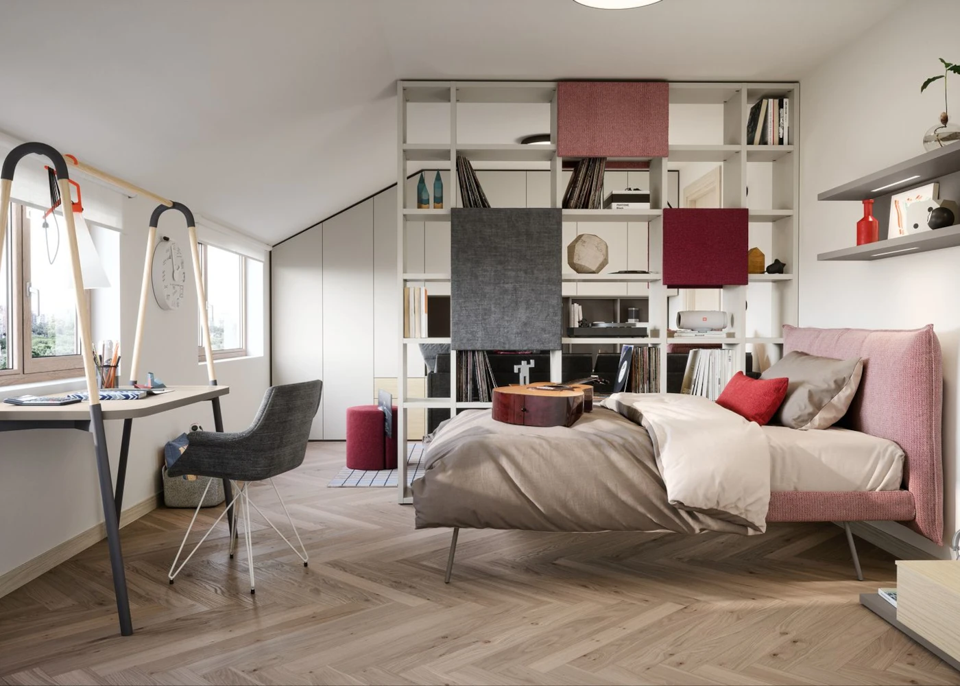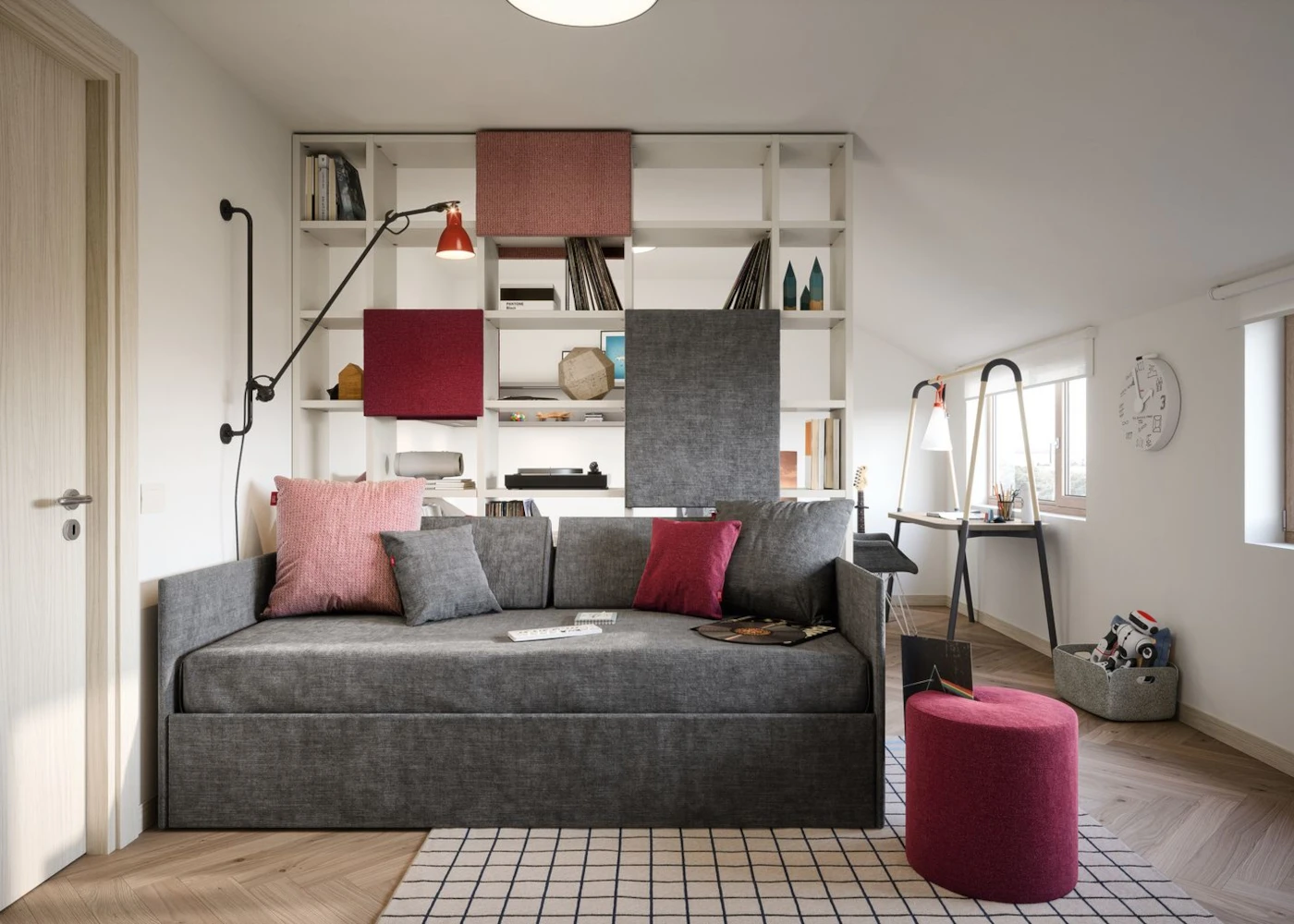 Cameretta multifunzionale con letto divano e libreria: design e funzionalità in un unico spazio