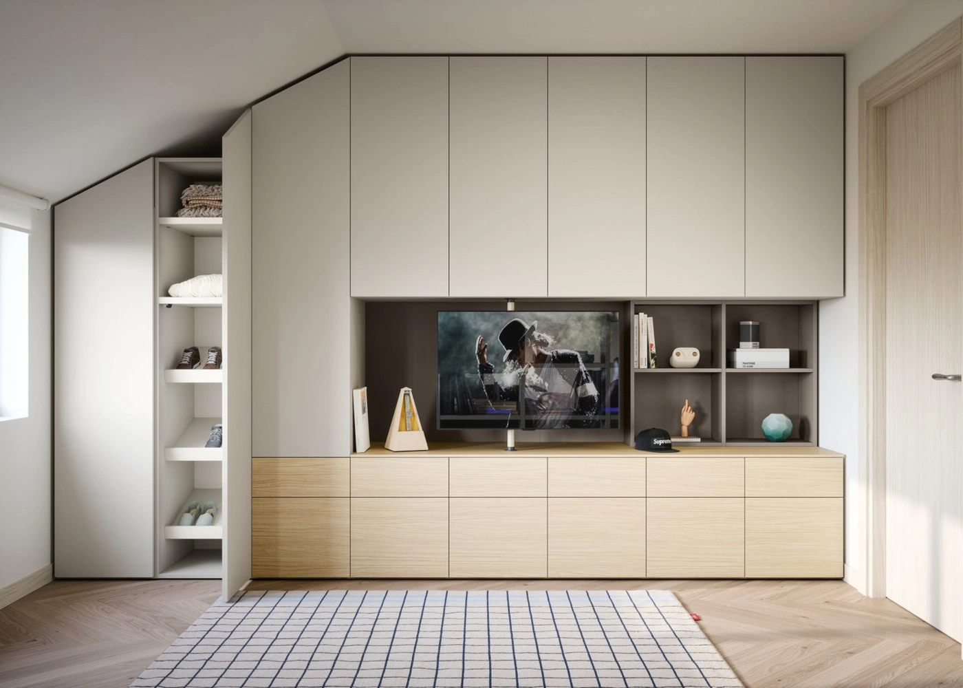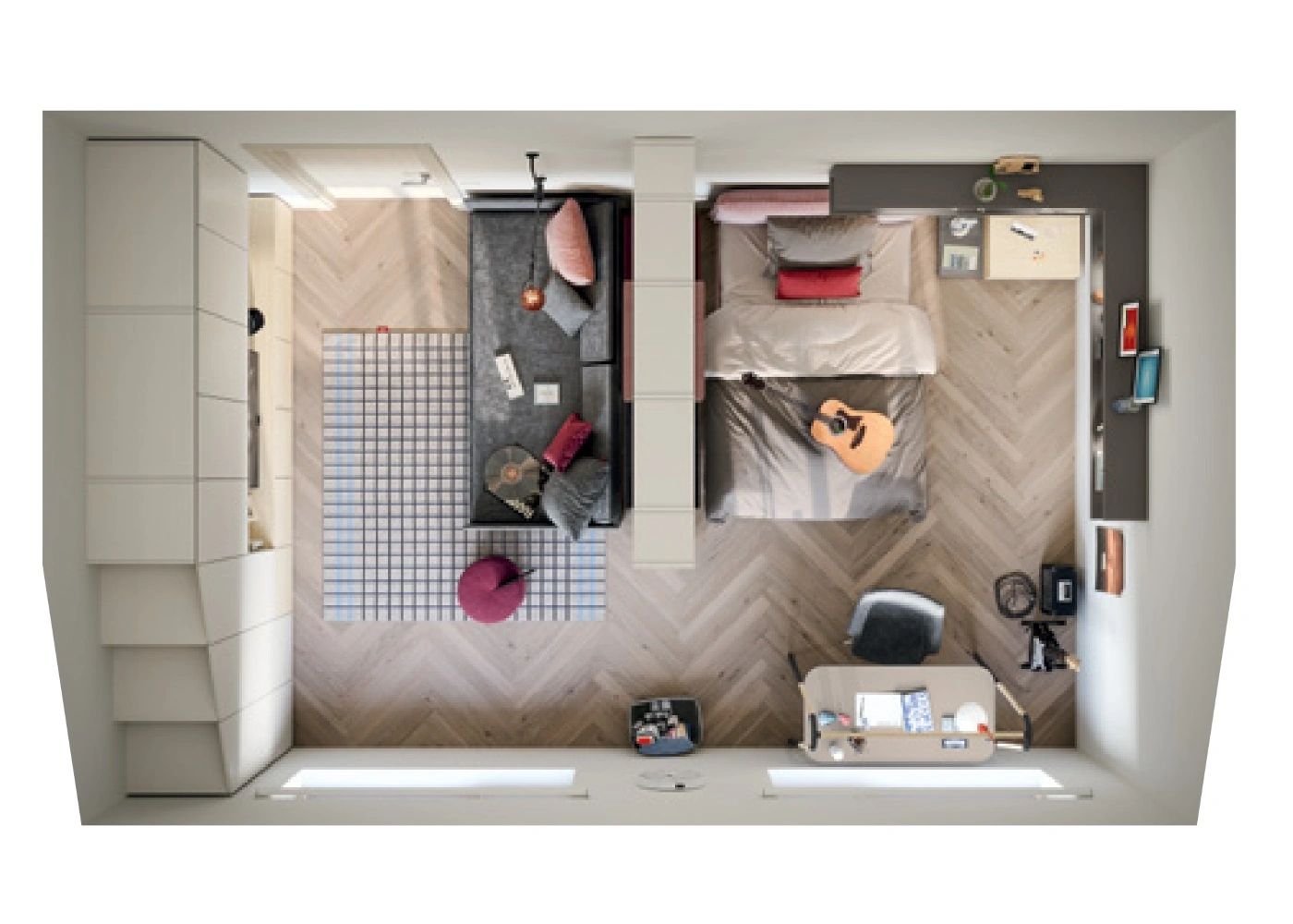 La parte giorno della stanza ospita una zona TV moderna integrata all’armadio con divano letto a rete estraibile. Questo elemento, oltre a garantire un posto in più per gli amici, offre un pratico box contenitore ad apertura laterale, perfetto per riporre biancheria o cuscini. L’armadio battente con cassetti e cestoni inferiori, vano centrale e moduli superiori garantisce ordine e capienza, mentre il lato sinistro segue il soffitto mansardato grazie a un taglio su misura. Infine, i cuscini imbottiti e il pouf Noel completano la zona relax con un tocco accogliente e giovane.