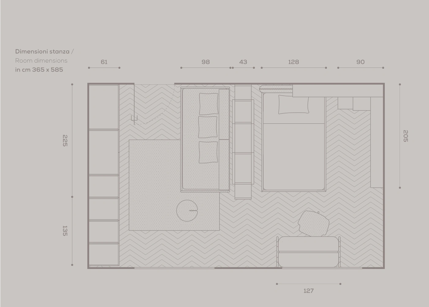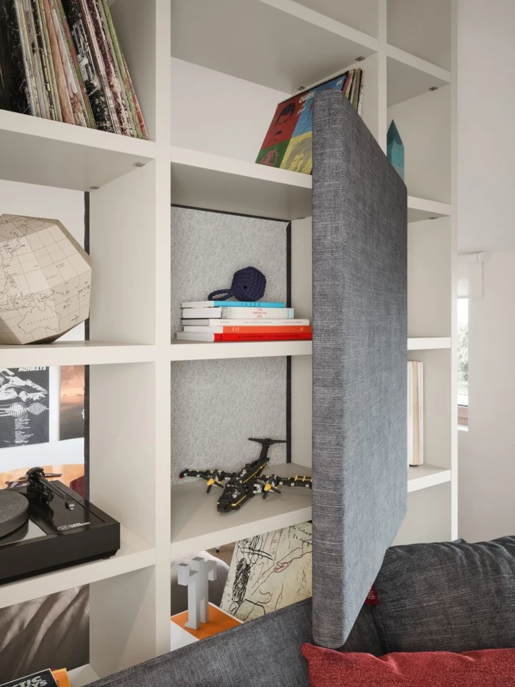 La libreria Holly è un elemento centrale della composizione. Grazie ai suoi fianchi e ripiani da 3 cm e alle ante Soft imbottite e rivestite in tessuto, svolge la doppia funzione di contenitore e divisorio. Così, la stanza si organizza in due aree distinte: la zona notte e quella dedicata al relax, senza perdere continuità estetica.
