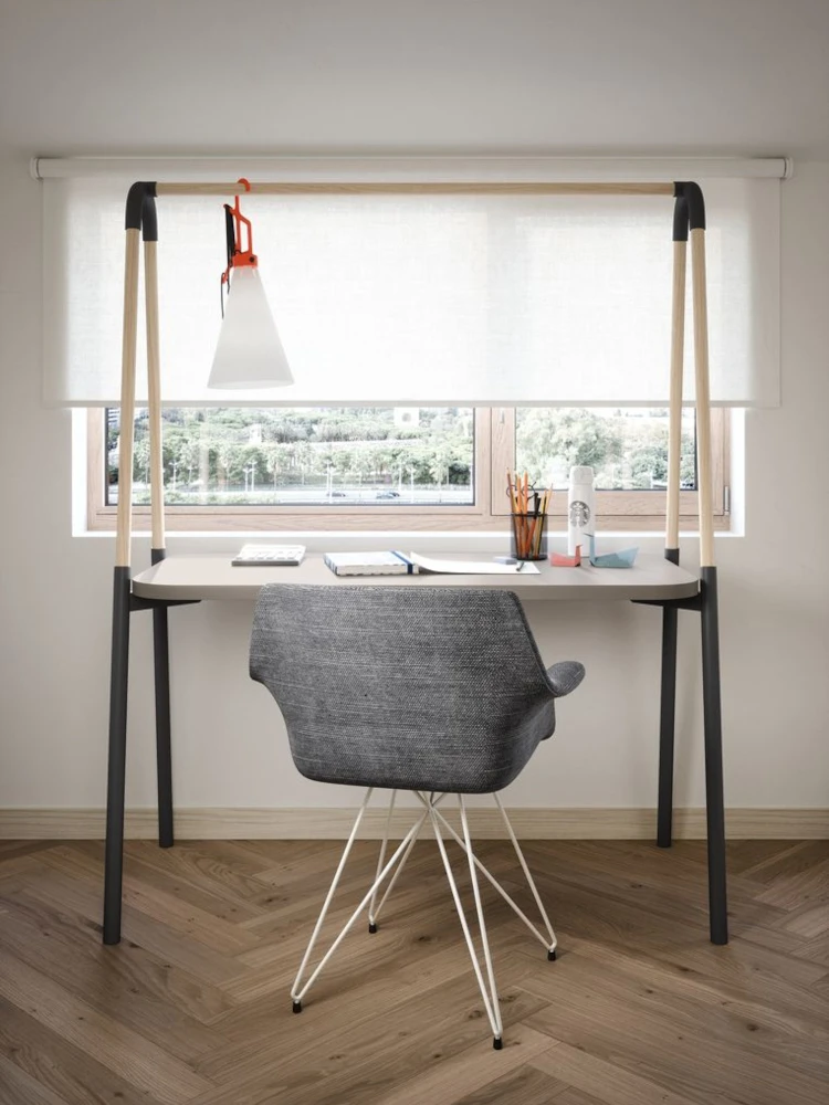 La cameretta integra anche un’area dedicata allo studio. Infatti, il sistema scrittoio Loop in legno massello con raccordi e gambe in metallo è pensato per essere ergonomico e resistente. Il piano sagomato, inoltre, rende la scrivania pratica e originale. A completare lo spazio, la sedia Leaf imbottita, che assicura comodità e sostegno anche durante le lunghe ore di studio.