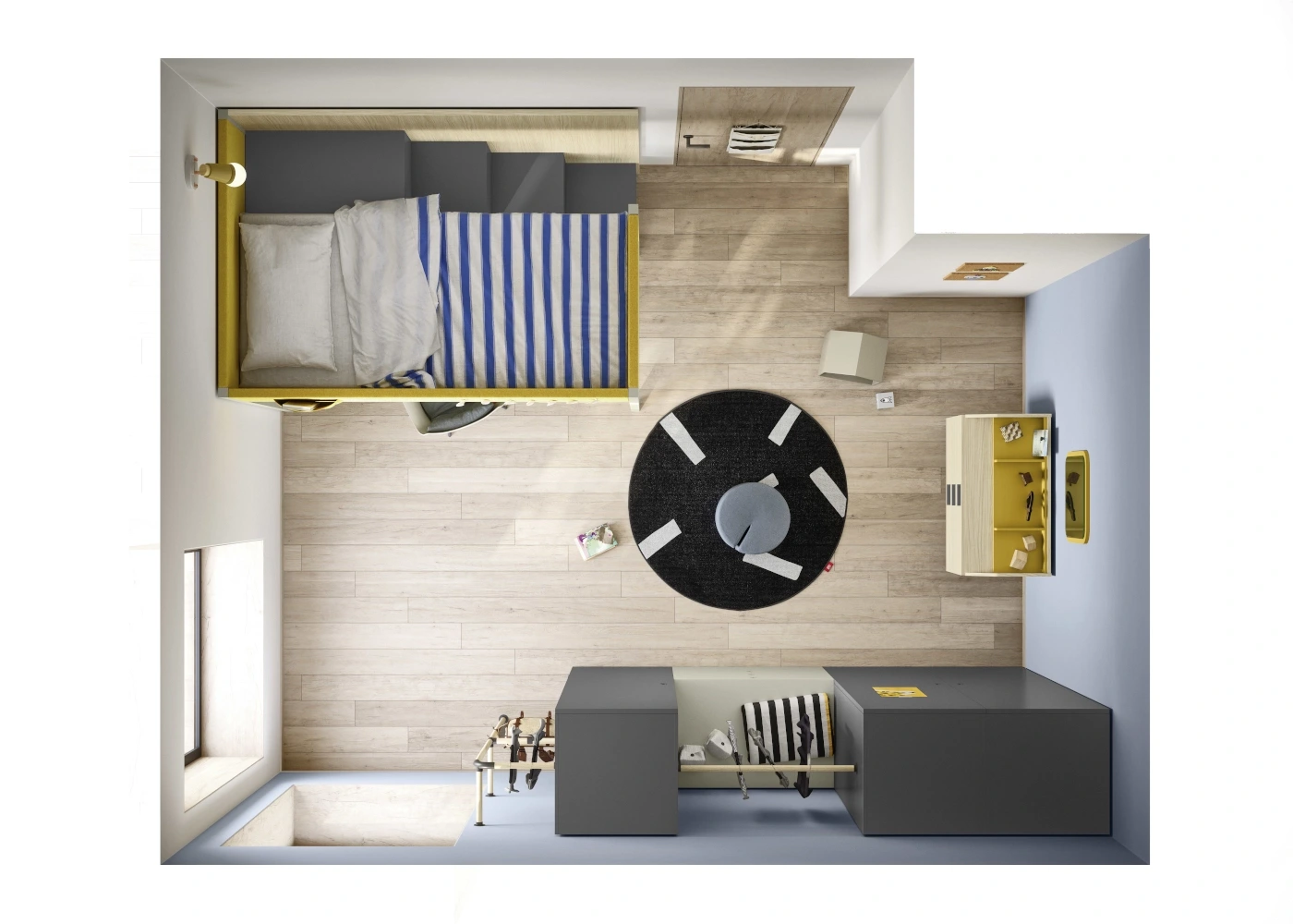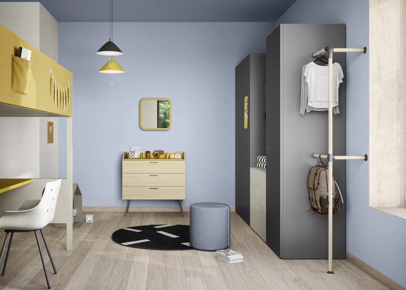 Il letto a castello con scrittoio Camelot può essere inserito in composizioni complete che comprendono: