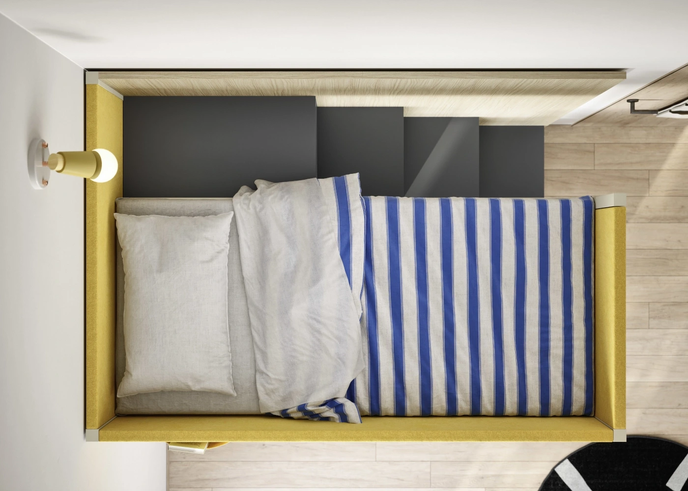 Inoltre, la scala posteriore a libreria non è solo un accesso comodo al letto superiore, ma diventa anche un pratico spazio contenitivo.