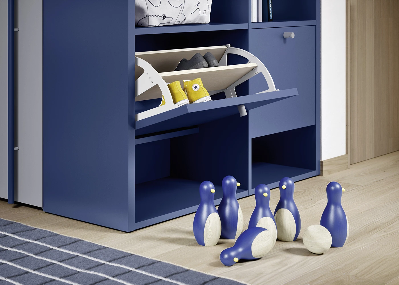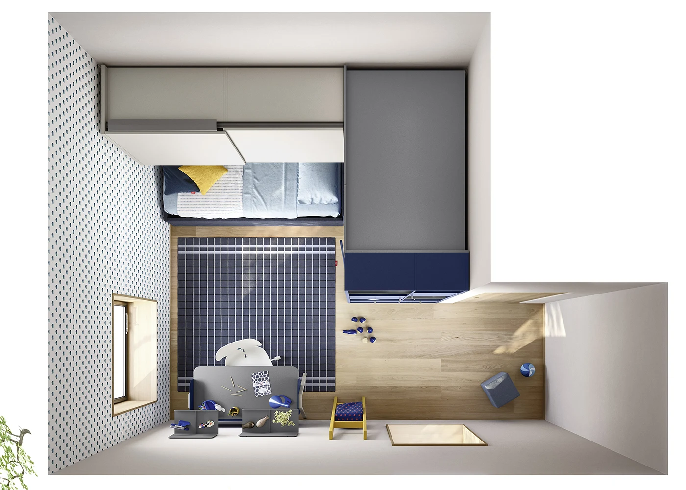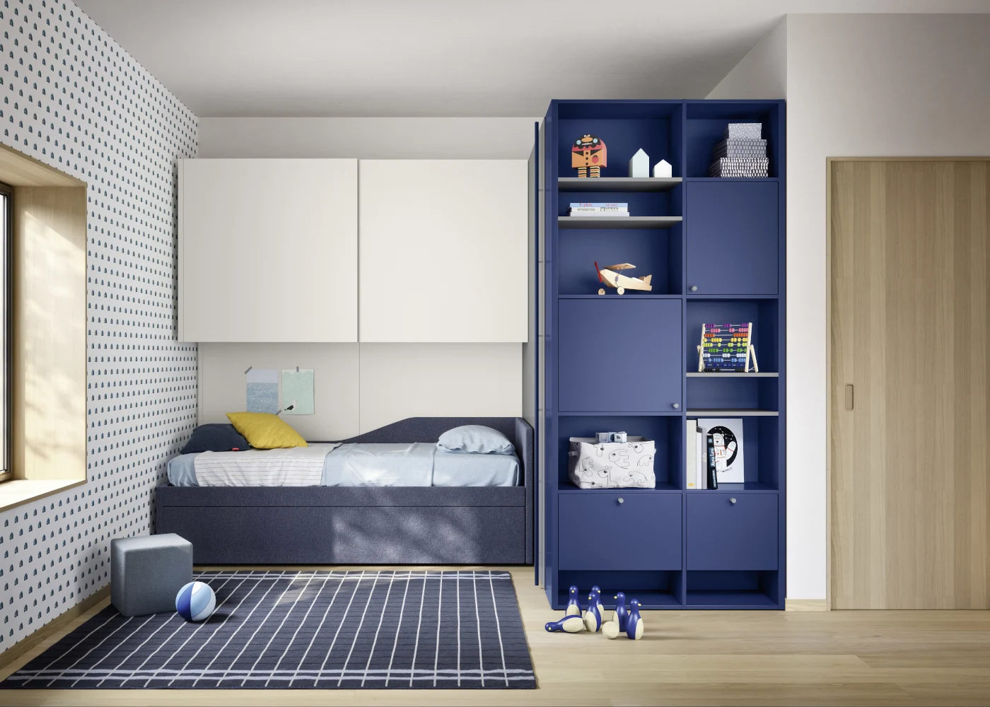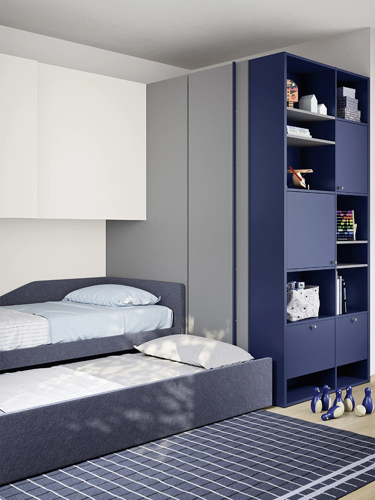 La scrivania William trova posto in una cameretta versatile, progettata per unire studio, riposo e organizzazione. Da un lato, la cabina armadio Cabì con interno Palù si sviluppa ad angolo, affiancata dal letto imbottito con secondo letto estraibile in tessuto sfoderabile, posizionato sotto all’armadio a ponte con ante scorrevoli e fianco aperto. Dall’altro lato, la libreria terminale Luce chiude la cabina e integra pratiche ante a ribalta porta-scarpe, garantendo ordine e funzionalità.