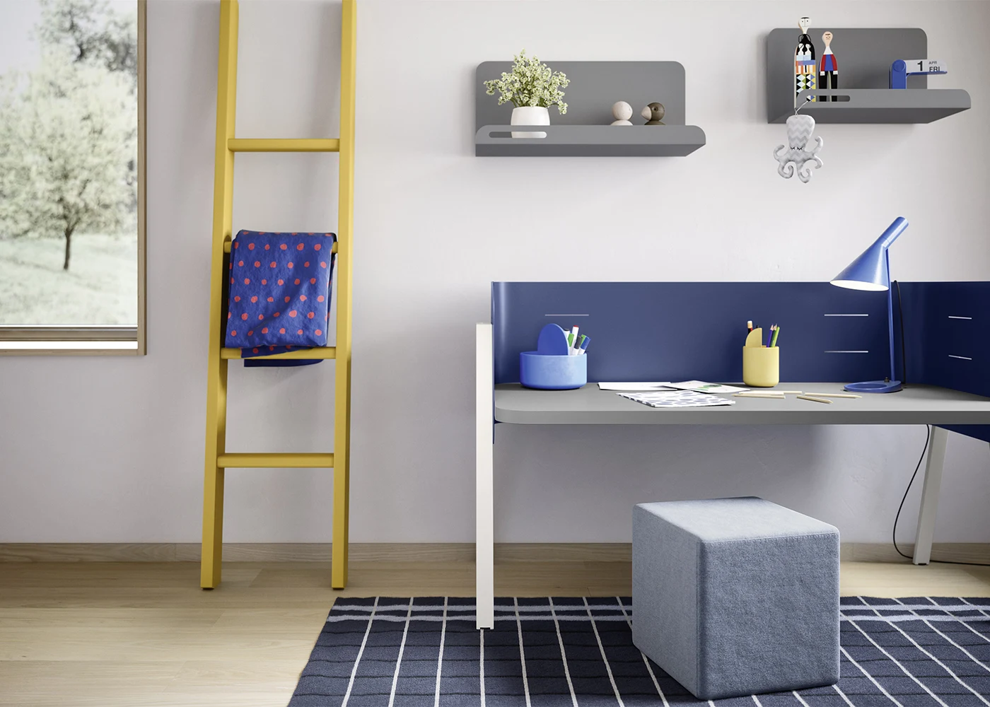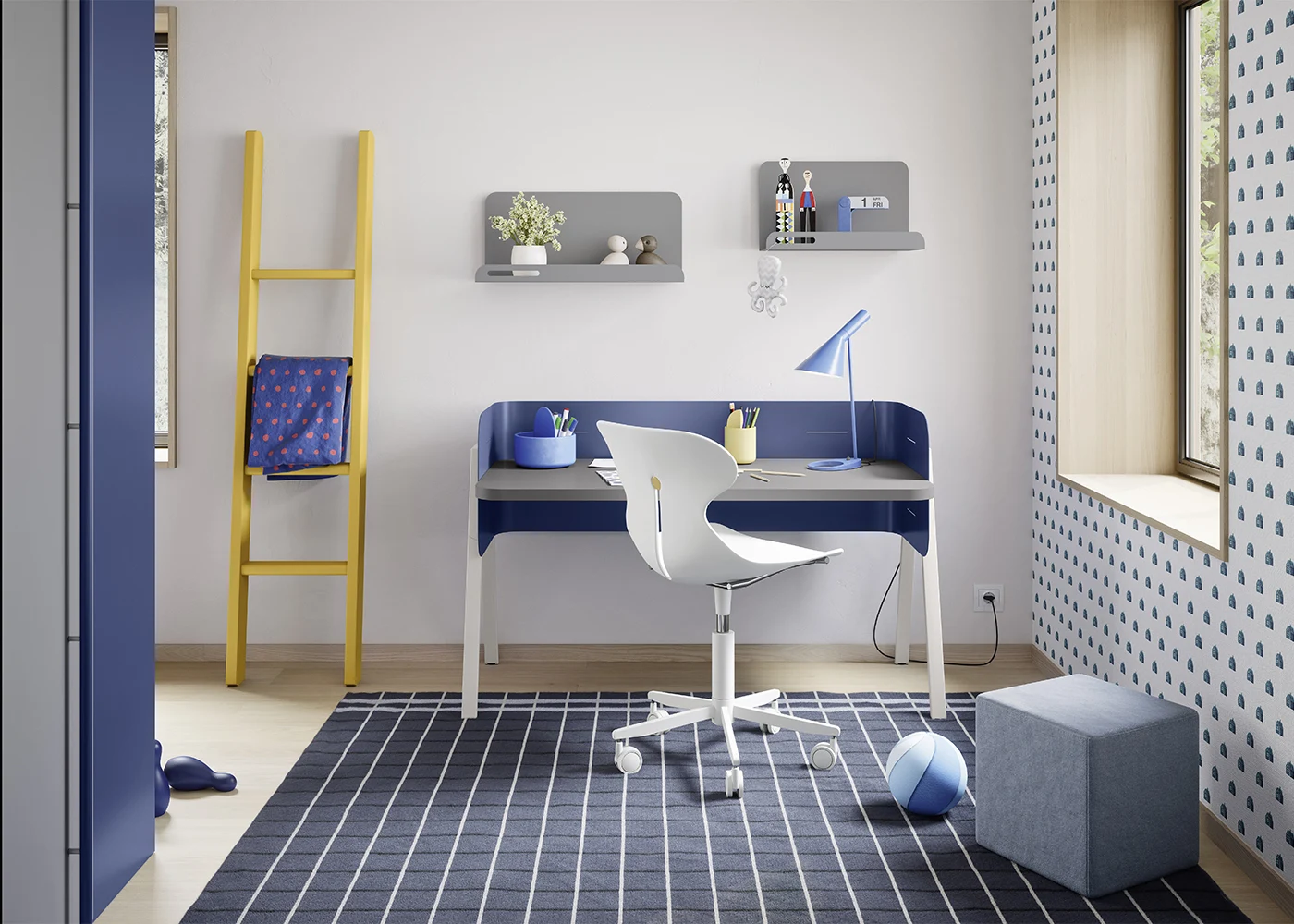La scrivania William unisce linee moderne e materiali resistenti. Lo schienale in metallo le dona solidità e carattere, rendendola perfetta anche come elemento d’arredo. Sopra, le mensole Hook in lamiera offrono uno spazio pratico dove organizzare libri, piccoli giochi o oggetti personali. Inoltre, l’angolo studio può essere completato con accessori come la sedia Marì, ergonomica e confortevole, o con il pouf Cube, che aggiunge colore e versatilità. Infine, la scaletta Flatty, dal design leggero, arricchisce la composizione con un tocco estetico distintivo.