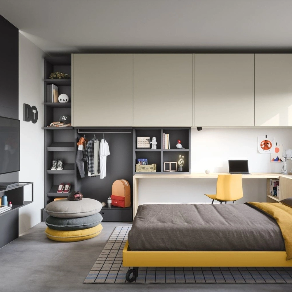 Le soluzioni Nidi combinano design italiano, modularità e attenzione ai dettagli, offrendo ambienti su misura che si evolvono con la crescita. Infatti, ogni composizione nasce per accompagnare le diverse fasi della vita dei ragazzi, adattandosi alle loro esigenze in continua trasformazione. La stanzetta per ragazzi con letto sommier e armadio pensile con ante complanari rappresenta quindi la scelta ideale per chi desidera un mix perfetto tra funzionalità, ordine ed estetica contemporanea.