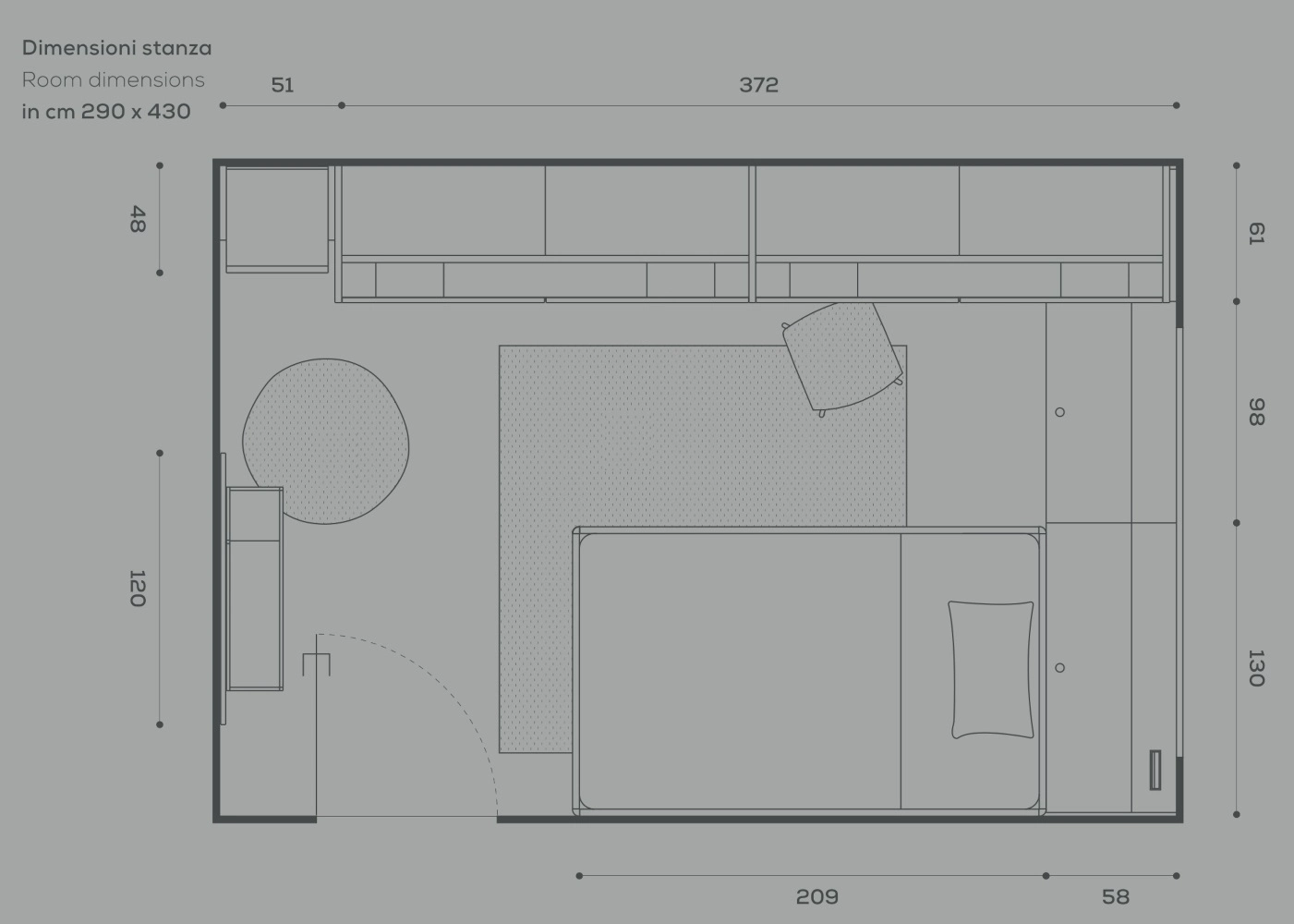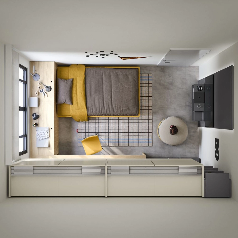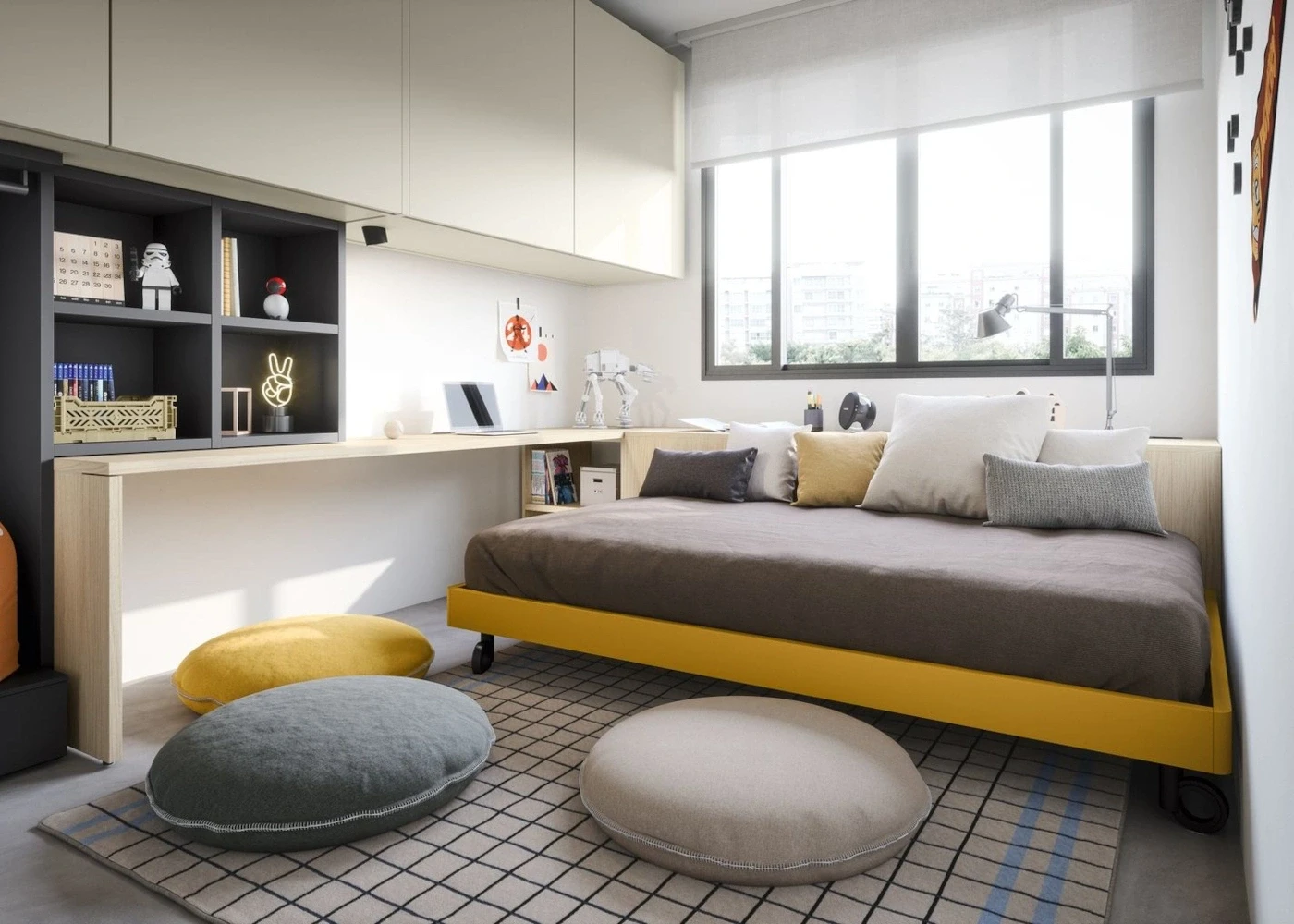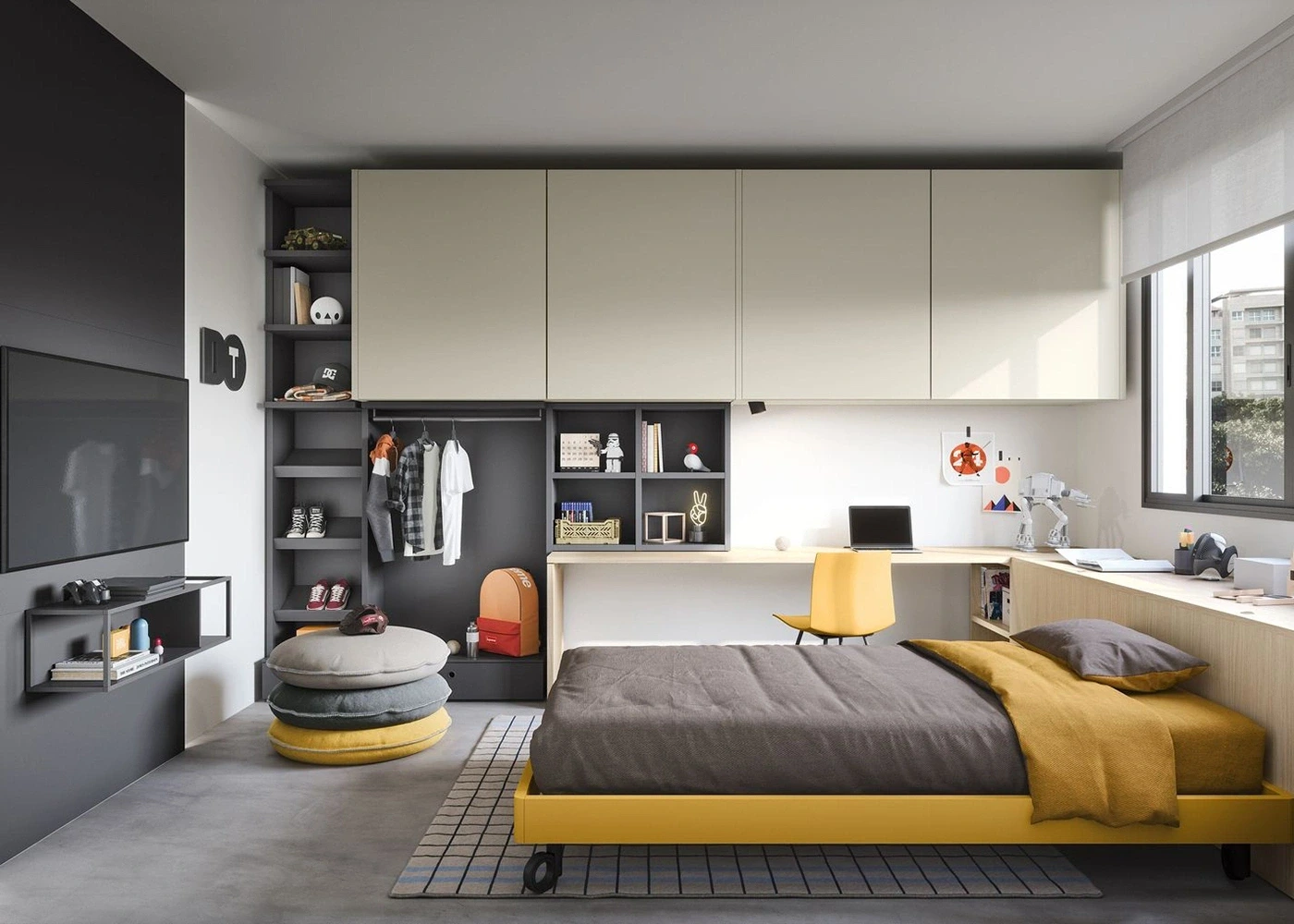 Il protagonista è il letto sommier da 120 cm con ruote, che si sposta facilmente per liberare spazio nella stanza e può scorrere sotto la scrivania più lunga. In questo modo, l’uso dello spazio diventa ancora più pratico. Il retroletto contenitore, che corre lungo la finestra e funge anche da testata, è dotato di apertura superiore: una soluzione comoda per custodire guanciali, coperte e trapunte. Così l’ambiente risulta sempre ordinato e funzionale. Per questo motivo la stanza diventa flessibile, pronta a trasformarsi in base ai momenti di studio, gioco o relax.