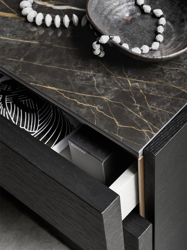 Un altro particolare del trittico “Status” è rappresentato dai frontali di forte spessore, impreziositi dalla presa laterale che rende l’apertura dei cassetti elegante e intuitiva. La gola laterale, realizzata con una sottile lamina in metallo abbinata al top in ceramica, regala un ulteriore tocco di stile, sottolineando l’accuratezza dei dettagli. I fianchi inoltre, lievemente rialzati incorniciano il piano, aggiungendo un senso di equilibrio e armonia al design complessivo.