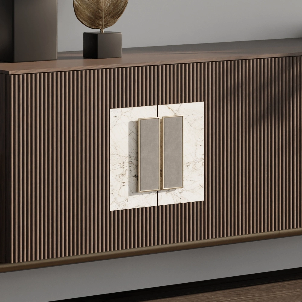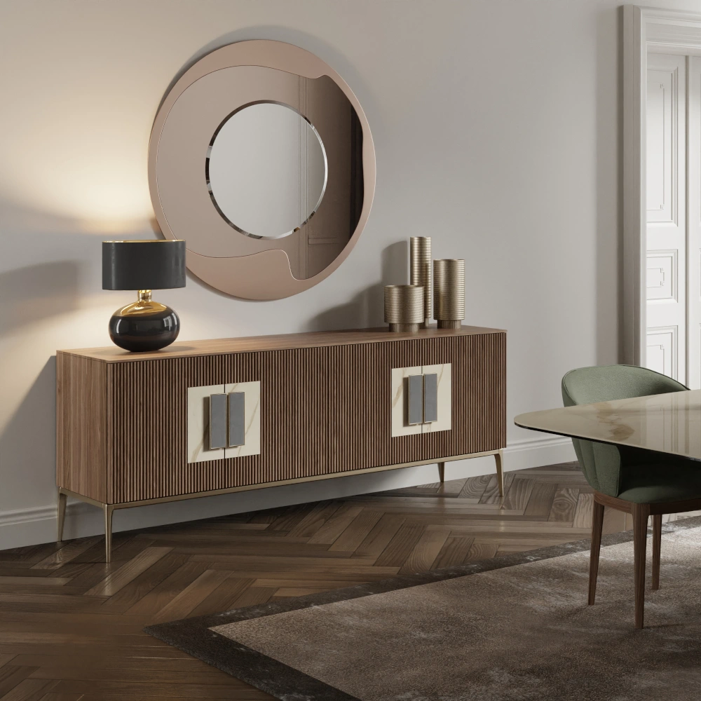 4 ante cannettate sono il cuore del design della madia Lena. Il motivo verticale crea un ritmo armonioso sulla superficie del mobile. Ogni anta è realizzata con precisione per garantire durata e continuità estetica nel tempo.