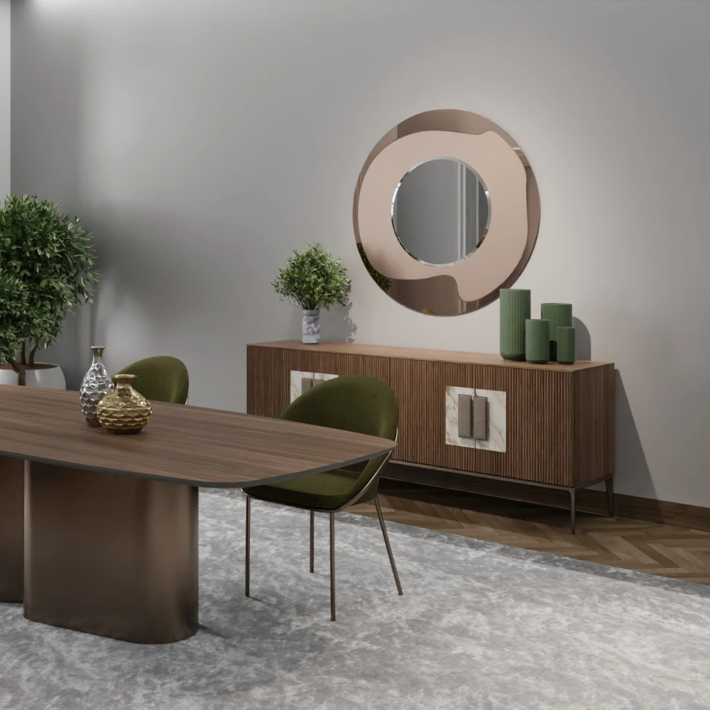Il catalogo comprende tavoli fissi e allungabili, disponibili in diverse forme e finiture. Le sedie offrono comfort, leggerezza visiva e un’ampia scelta di rivestimenti. Completano la proposta madie, consolle, specchi e tavolini, che permettono di creare ambienti coordinati e armoniosi.