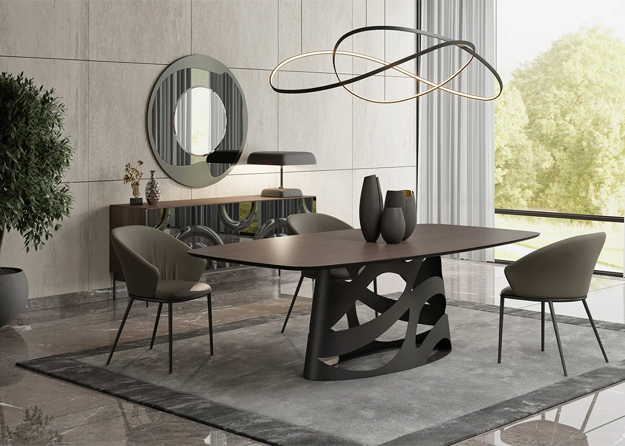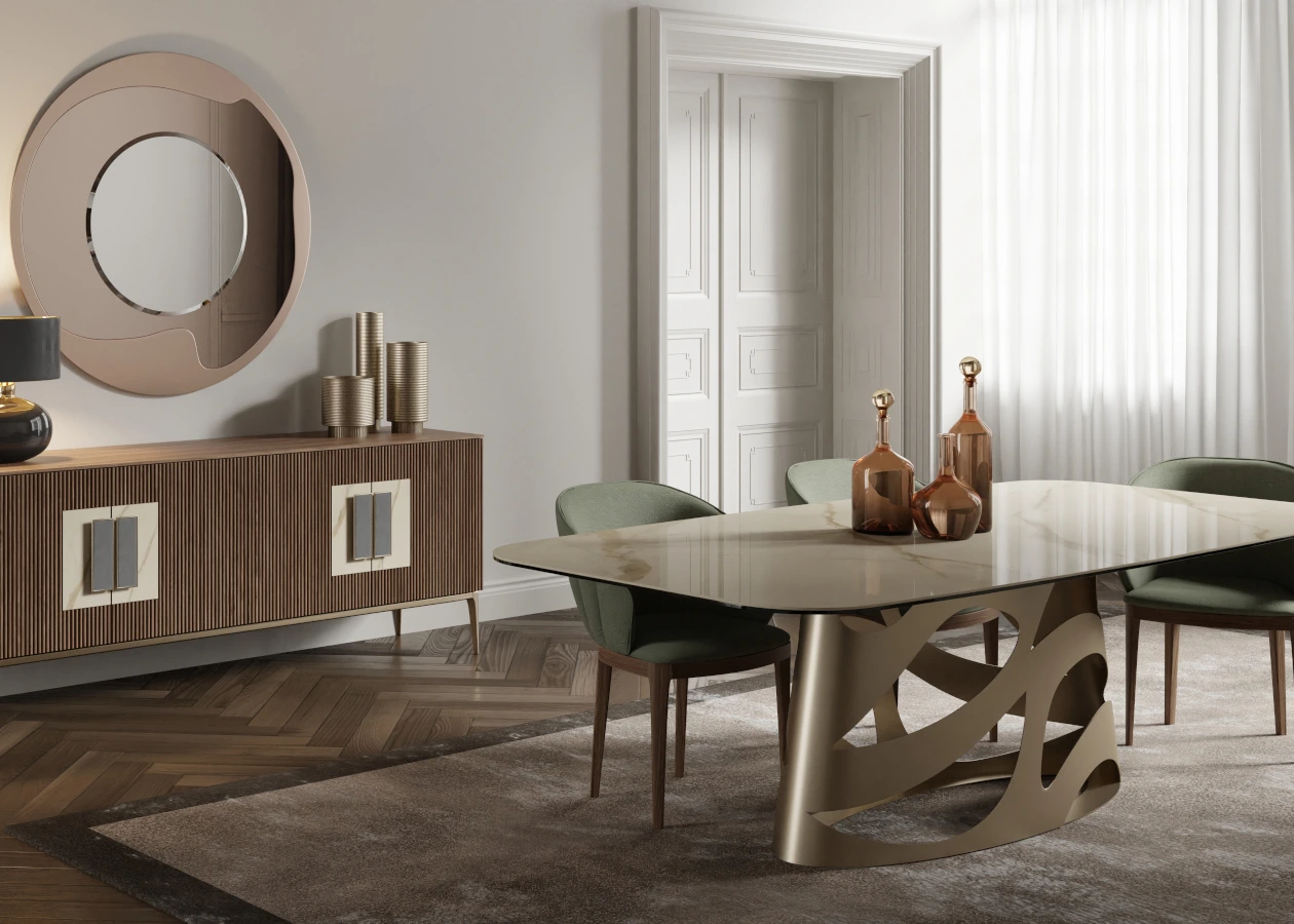 Vieni a trovarci nel nostro showroom di Maddaloni per progettare insieme la sala da pranzo dei tuoi sogni con il tuo nuovo tavolo con basamento scultoreo.