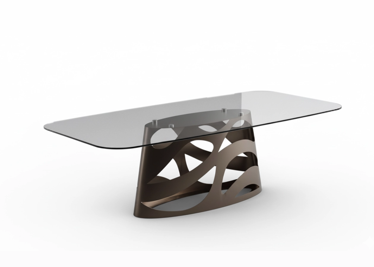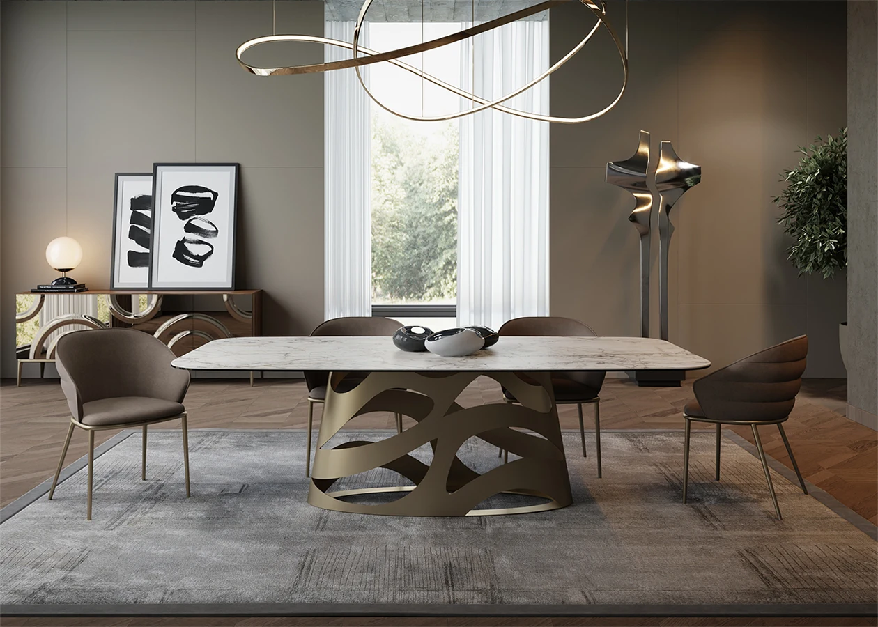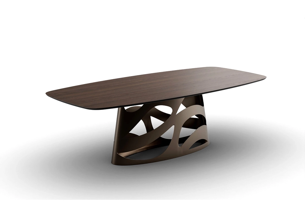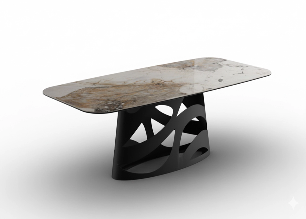 Il cuore del Tavolo Elia Zamagna risiede nella sua struttura portante: il basamento centrale in metallo. Progettato con linee sinuose e incrociate, questo elemento scultoreo garantisce una stabilità eccezionale e trasforma il tavolo in un punto focale artistico. È un capolavoro di ingegneria estetica.