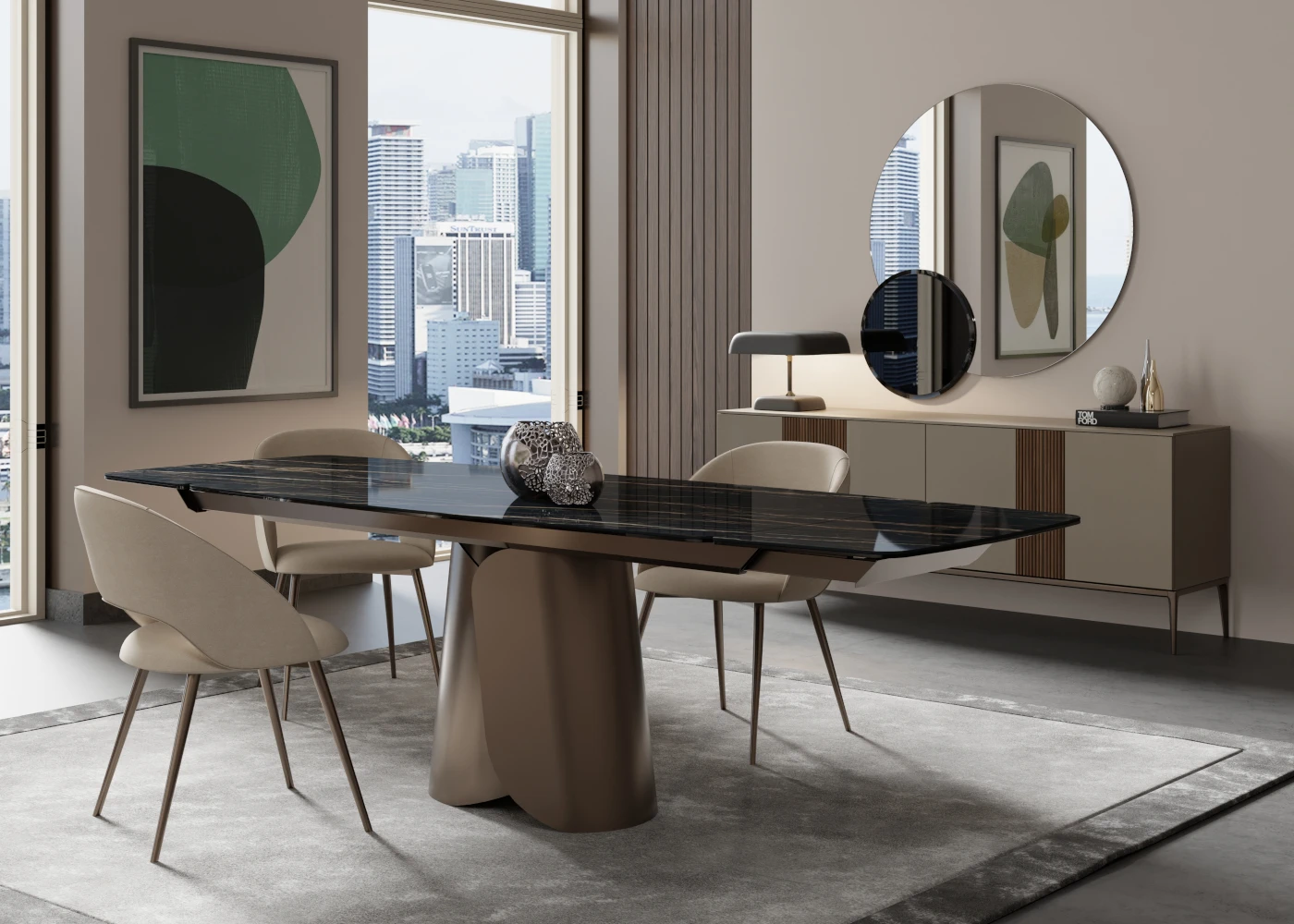 Il tavolo tondo in ceramica Fusion di Zamagna Italia valorizza la zona pranzo con eleganza equilibrata e design contemporaneo.