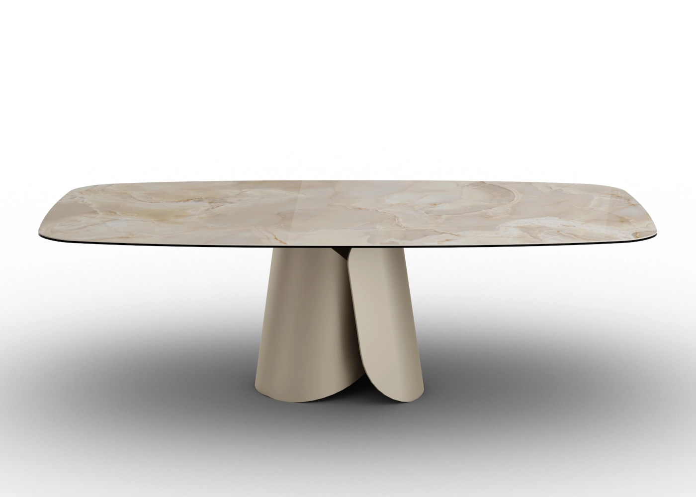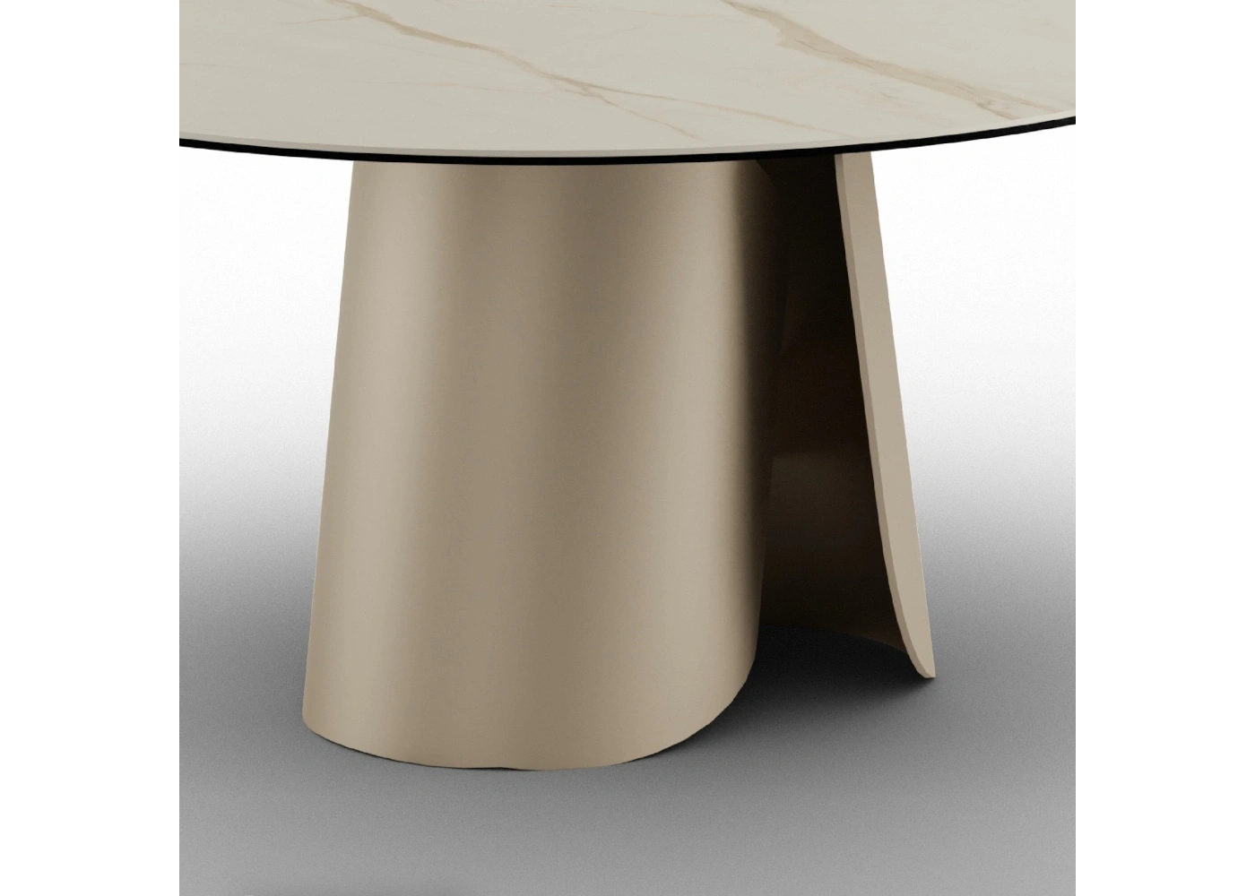 Il basamento in metallo, proposto nelle finiture della collezione Zamagna, offre stabilità e leggerezza visiva in zona pranzo .